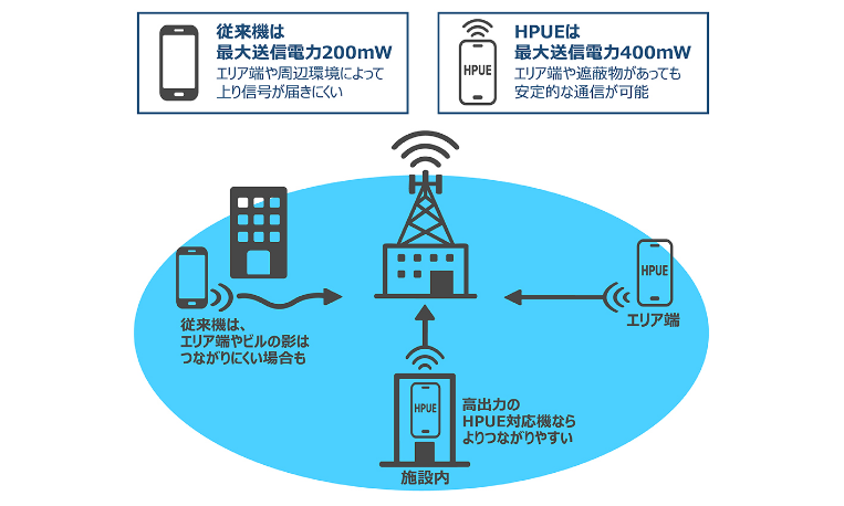 HPUEは、通信機器(スマートフォンなど)の送信電力を高めることで通信の届きやすさを向上させる技術です。従来、スマートフォンの送信電力は200mWに制限されていましたが、HPUEではこれを400mWに引き上げることで、電波が基地局により届きやすくなります。