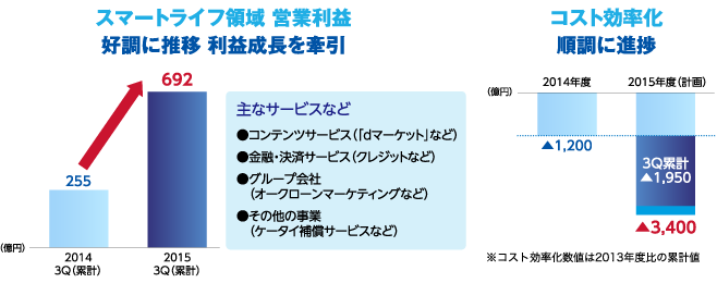 スマートライフ領域においては、「dマーケット」などのコンテンツサービス、クレジットなどの金融・決済サービス、オークローンマーケティング※2などのグループ会社におけるサービスが利益成長を牽引しました。