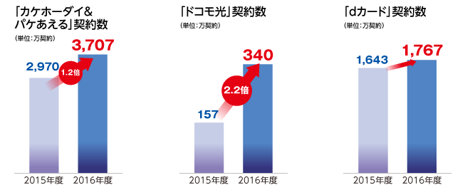 通信事業においては、料金プラン「カケホーダイ&パケあえる」のさらなる充実に取り組んだ結果、その契約数が3,707万契約に拡大、「ドコモ光」契約数は340万契約に拡大しました。また、LTEネットワークは新たな高度化技術の導入により国内最速*1の受信時最大682Mbpsサービスを2017年3月に開始し、さらなる高速化を進めています。