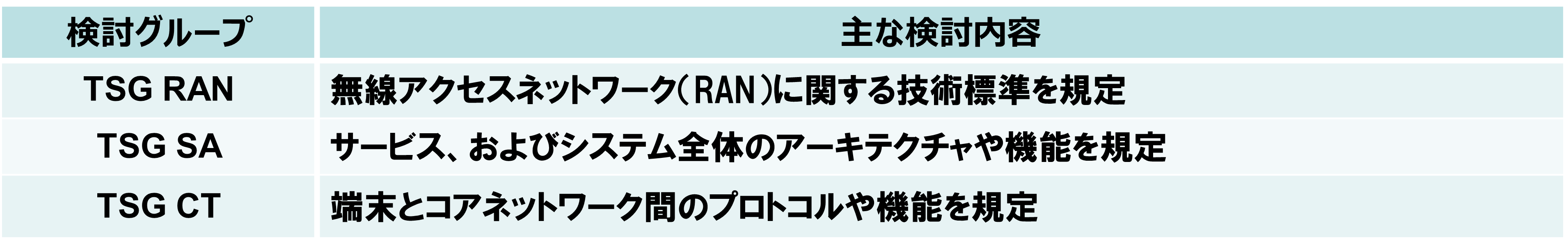PCGでは、3GPP全体の運営方針の検討と、その配下で技術の検討を行っているTSG(表1)間の連携を調整します。またTSGの配下には、各技術の内容に応じて実際の検討を行う複数のWG(Working Group)が存在します。