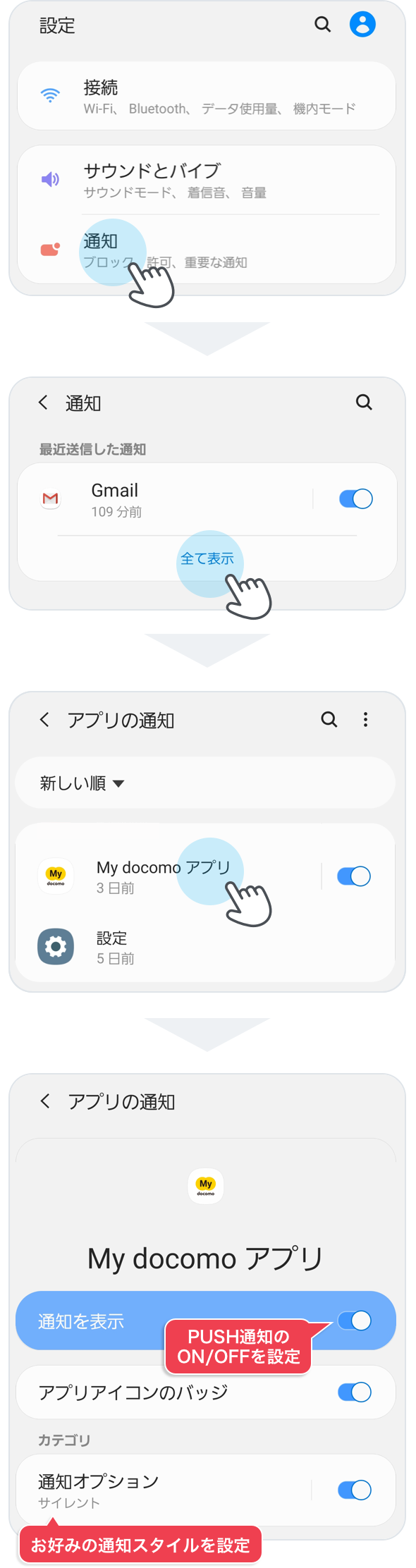 ご使用いただいている端末設定から、プッシュ通知のオン/オフができます。