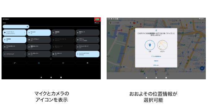 カメラ、マイク使用中にアイコンが表示されるようになり、アプリがカメラ、マイクを使用していることを一目でわかるようになりました。また位置情報の利用を許可する際に、正確な位置情報のほかにおおよその位置情報を選択できるようになり、お客さまご自身で、用途に合わせて利用する位置情報の粒度を選択できるようになりました。