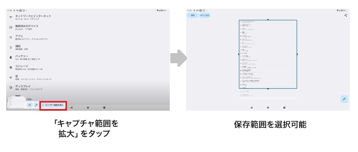 1画面に収まらない表示をスクリーンショットする場合、画面に表示されていない部分も含めて1つのスクリーンショットとして、撮れるようになりました。また、範囲選択により、好みの範囲で保存できます。