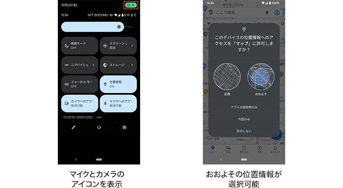 カメラ、マイク使用中にアイコンが表示されるようになり、アプリがカメラ、マイクを使用していることを一目でわかるようになりました。また位置情報の利用を許可する際に、正確な位置情報のほかにおおよその位置情報を選択できるようになり、お客さまご自身で、用途に合わせて利用する位置情報の粒度を選択できるようになりました。