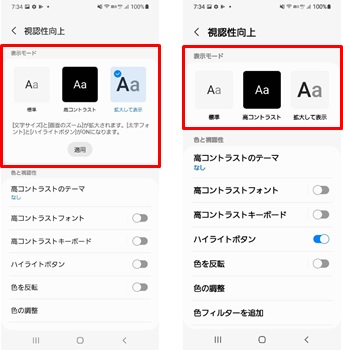「高コントラスト」モードと「拡大して表示」モードが選択できるようになります。