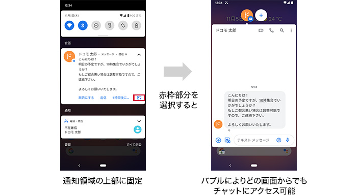 チャットやSNSアプリ等に関する通知が、通知領域の上部に固定され、他の通知と見分けがつくようになりました。また、バブルを開始することができるようになりました。バブルによってどの画面からでもチャットにアクセスすることができます。