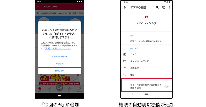 アプリの位置情報・マイク・カメラに関するユーザー許諾に「今回のみ」の選択肢が追加され、アプリが情報を常に利用するのを制御できるようになりました。また、一定期間利用していないアプリから、過去に付与した位置情報やマイクなどへのアクセス権限を自動的に削除するようになりました。